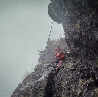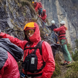 Ein schneller Stoßtrupp aus vier Bergrettern stieg mit Abseilmaterial direkt über den Klettersteig zu den in Not Geratenen auf. Gleichzeitig machten sich weitere Einsatzkräfte von unten auf den Weg, um die Gruppe im unteren Bereich des Steigs nach dem Abseilvorgang in Empfang zu nehmen.